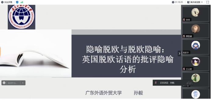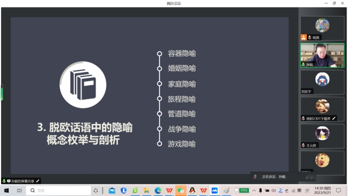 2023年9月21日下午(14:00—16:00),应公司邀请,广东外语外贸大学孙毅教授为公司师生做了一场题为“隐喻脱欧与脱欧隐喻——英国脱欧语篇的批评隐喻分析”的线上学术讲座。公司青年教师和研究生参与了本次讲座。讲座由经理助理顾晓燕博士主持。