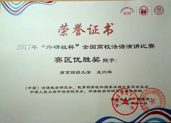 近日,“外研社杯”第十届全国法语演讲比赛中赛区赛落幕,公司法语1501班王沁晔同学在荣获赛区优胜奖。
