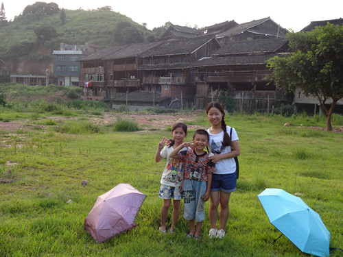 每天两个小时的教学时间,前一个小时由老歌师教唱侗歌,前三天已完成侗族儿歌和蝉之歌的教学任务,后两天把男女生分开进行河边歌(对唱)教学,从歌词到歌声循序渐进。令人欣慰的是,再调皮的孩子在学习侗歌时也会立马变得聚精会神,连上厕所也要主动征得老师同意后才去;而孩子们童稚的歌声也吸引了公司附近的村民,常常有人顶着烈日到教室外围观,甚至有个别“编外”小学员来到少年侗歌班“偷师学艺”。而后一个小时则由“古梦清泉”暑期实践团成员开展辅导,作为语言专业的石贤给歌班小学员上了两堂日语课,教给孩子们几句简单的日常用语。令人惊奇的是有个小男孩学得特别快,而且发音十分标准,被任命为领读;学得慢的小朋友我们就鼓励他们课间单独找老师辅导,多练习几遍。于是课里课外都充满好学的气氛,小朋友之间互相道礼,十分可人。而理科出生的吴绍依同学则发挥自己的专业特长,给孩子们辅导数学,耐心细致地一遍遍引导他们去思考。为了培养孩子们的集体意识,同学们还带领他们做些小游戏,一起完成小任务等。经过一周的相处,实践队员和少年侗歌班的孩子日渐亲密起来,黑板上每天更新的倒计时不仅提示着汇报演出的日期,同时也标示着大家日渐缩短的相处时间。