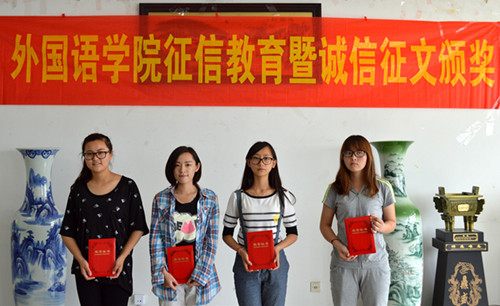 此次活动中还同时举办了EVO真人视讯诚信征文比赛颁奖仪式。征文比赛面向公司全体员工开展,旨在引导大家在日常生活的点点滴滴恪守诚信。经过评委评选,英语1301班俞菁菁撰写的七言绝句《立木》获征文比赛一等奖,法语1301班蓬璐嘉撰写的散文《诚信》获二等奖,英语1302班岳萌萌撰写的《点一盏诚信之灯,照亮校园》以及英语1401班赵文竹撰写的《诚信,人生的风帆》获三等奖。