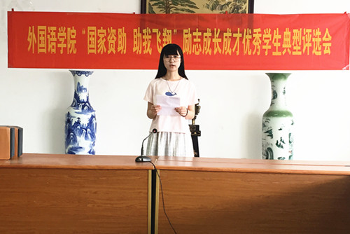 在评选会中,8位家庭经济困难员工代表与在场同学们分享了自己在大学阶段的学习和成长经历。他们虽然家庭经济上存在一定困难,但是在生活态度上却乐观向上。他们中的很多人不仅学习成绩优异,而且在参与社会实践、志愿服务和担任员工干部的工作中都取得了骄人的成果。其中,英语1302班的石贤同学来自贵州侗寨,她热爱民族文化,曾带领暑期实践团队对侗族大歌的传承和发展进行了系统深入的调研;英语1302班的杨柳同学放眼社会,曾带领团队参与“挑战杯”学术科技作品竞赛并获得了校赛一等奖的好成绩;法语1301班的王文文同学在担任班长的过程中,兢兢业业地为班级同学做好服务,同时她撰写的《用火色渲染平淡人生》入围2015年度助学成才典型事迹征文省级评选;法语1401班的刘雅惠同学在接受国家资助的同时不忘回报社会,积极利用课余时间参与志愿服务活动。