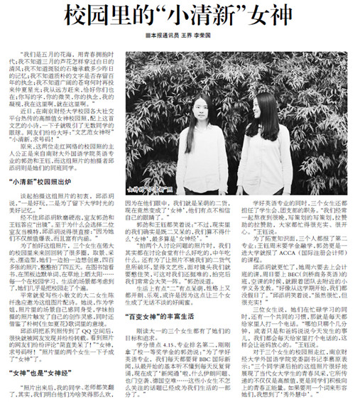 近日,公司英语1401班的三位女生郭劲、王钰和邱添玥风头正盛。因为由她们合作拍摄完成的一组“小清新”校园照走红网络,受到了同学们和媒体的追捧。在“中国江苏网”报道了此事之后,《扬子晚报》、《中国科学报》、人民网、凤凰网、中国新闻网、中国社会科学网等几十家媒体也相继转载报道了此事。