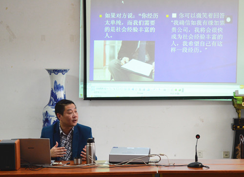 随后,周强先生结合外语专业人才需求,对如何做一份独特的简历和如何从容顺利地应对面试提出了建议。他提议,简历应简洁明了,措辞准确。在面试过程中,对企业文化的了解和对企业的忠诚度、强烈的归属感等内容也十分重要。周强先生还为大家讲解了一系列面试中经常出现的陷阱题和面试中的细节问题。
