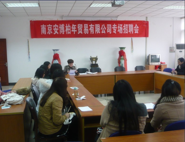 2011年12月5日下午两点南京安博柏年贸易有限公司招聘会在公司会议室举行。南京安博柏年贸易有限公司在公司招聘应届毕业生从事相关外贸出口工作。此次招聘的职位是外销助理。
