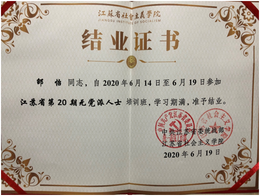 受公司统战部安排,2020年6月15日至19日,公司副经理邵怡参加了由中共江苏省委统战部、江苏省社会主义公司共同组织和举办的江苏省第20期无党派人士培训班,并以全勤表现顺利结业。参加本次培训班的无党派人士学员大多数来自于江苏省高校、科研院所以及国有企事业单位。