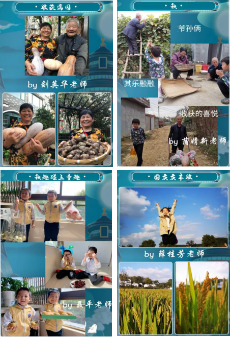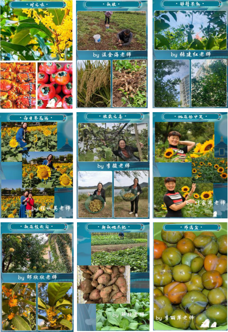 稻花香里说丰年,听取蛙声一片。公司师生们晒出的一张张丰收盛景上,是收获的果实,是喜悦的笑脸,是对当下的满足和对未来的希望。公司党委书记李骏在青山绿水边捧着满满一箩筐菱角,喜悦之情溢于言表;公司党委副书记刘英华的照片中是她的父母,他们怀中满满地捧着的是南瓜、冬瓜、芋头,而脸上洋溢着的是满满的幸福;程水英、叶家泉老师置身向日葵花丛中,人与花都散发着满满的活力,真可谓“待到山花烂漫时,她在丛中笑”。返乡的员工们说:“这次国庆节特意从南京回到家乡,吃着熟悉的家乡菜,看着以前年年都可以看见的乡村丰收景象,觉得特别亲切、满足。”