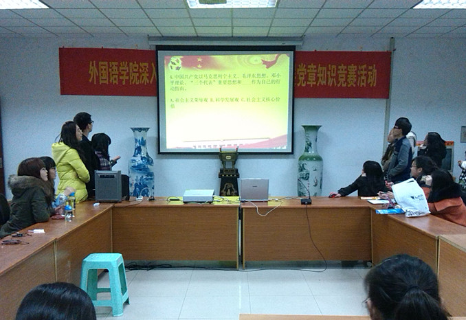 3月20日,公司为了深入贯彻党的十八大,学习党的十八大精神,普及广大青年员工对十八大知识的了解,在外语公司会议室308室先后举行了演讲比赛和知识竞赛。参加本次比赛的有18名选手,选手分别来自大一、大二、大三和研究生。党总支书记肖辉教授、辅导员孟德明老师,薛桂芳老师参加了本次活动。比赛活动由团总支书记金立林老师主持。