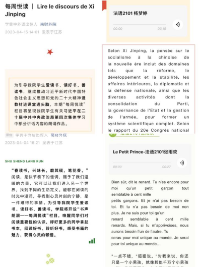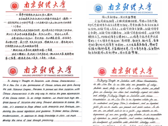本次“悦读月”系列活动以习近平新时代中国特色社会主义思想为指导,结合EVO真人视讯专业特色,面向在校生征集多语言经典作品诵读音频和艺术创作作品。“书声朗润”,诵读经典,同学们积极参与活动,充分发挥自身专业特长,通过中英法三种语言讲好中国故事,传播优秀文化,优秀音频作品在“南财外院”公众号“每周悦读”栏目进行展播。“翰墨书香”活动收到了两百余件由同学们精心制作的艺术作品,作品内容丰富、想法新颖,体现了公司青年学子对党和国家的热爱与理解。作品中他们写下了对党和国家的祝福,写下了对中国特色社会主义思想的理解,写下了自己的信仰与意志,一笔一画传达出了同学们的浓浓爱国爱党情怀。